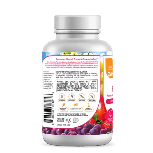 ZAHLER® KidsActive™ este un supliment avansat conceput pentru a sprijini concentrarea si atentia copiilor activi. Aceste tablete masticabile cu aroma delicioasa de punch de fructe ofera un amestec tintit de nutrienti esentiali, inclusiv Citicolina, vitamine din complexul B si L-Theanina, care contribuie la sustinerea functiei cognitive normale la copii sanatosi si activi.